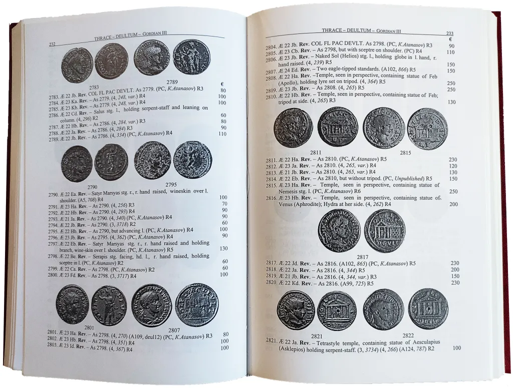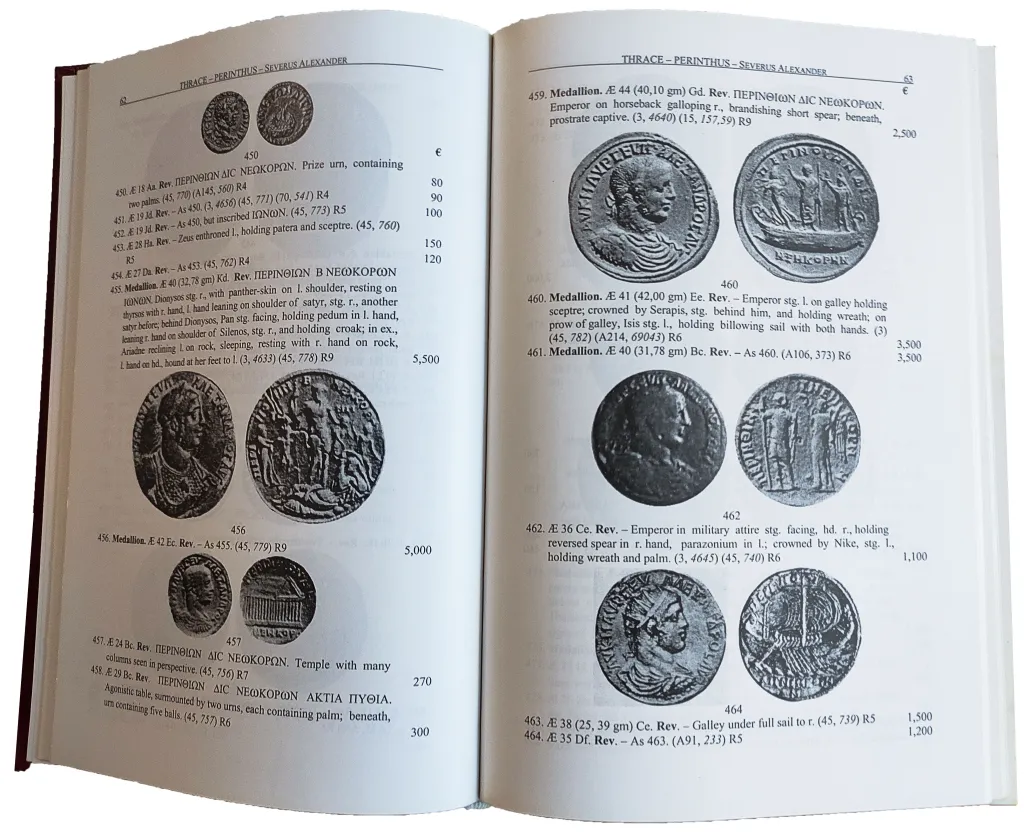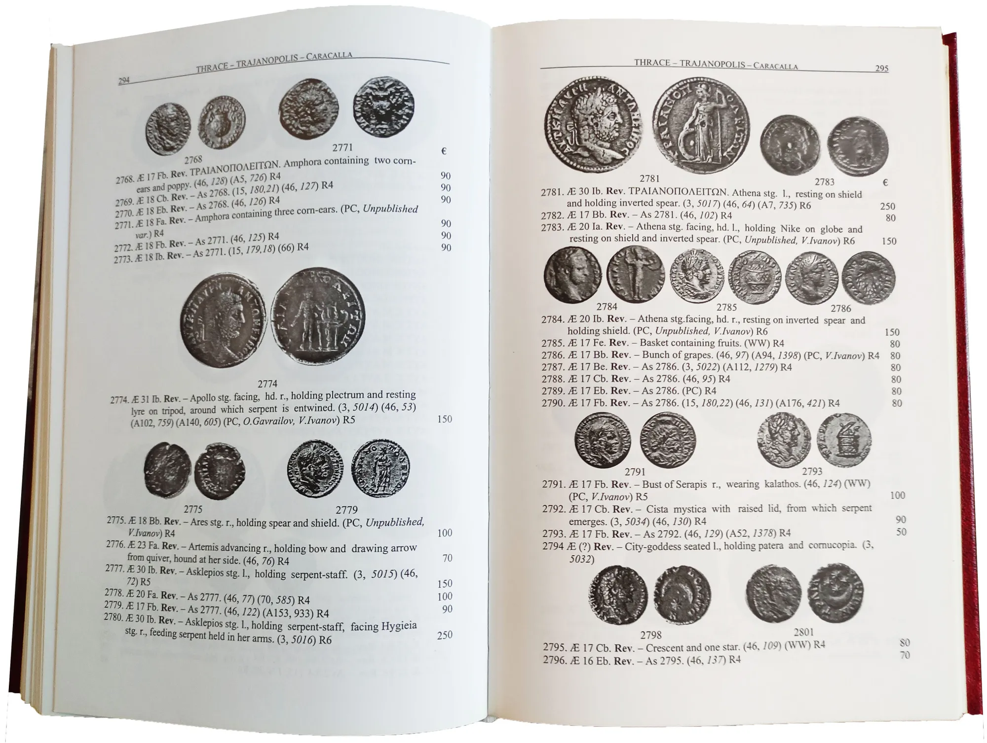 Volume 2 contains short descriptions of the obverse and reverse types of Greek Imperial coins struck in the Balkan mints, followed by a detailed description of the Greek Imperial coins struck in Thrace: Abdera, Ainos, Anchialus, Apollonia Pontika, Augusta Trajana, Bizya, Byzantion, Deultum, Hadrianopolis, Maroneia, Mesembria, Nicopolis ad Nestum and Pautalia. Over 5,250 Greek Imperial coins are described and 1,742 black-and-white photographs presented. In the Appendix there is a detailed map of the cities on the Balkan Peninsula which issued Greek Imperial coins, as well as an index of the emperors, their relatives, and the people depicted on the coins. The valuations given in this catalogue are with degree of rarity from R1 to R10. Each original book goes with a replica of a rare specimen from Pautalia.