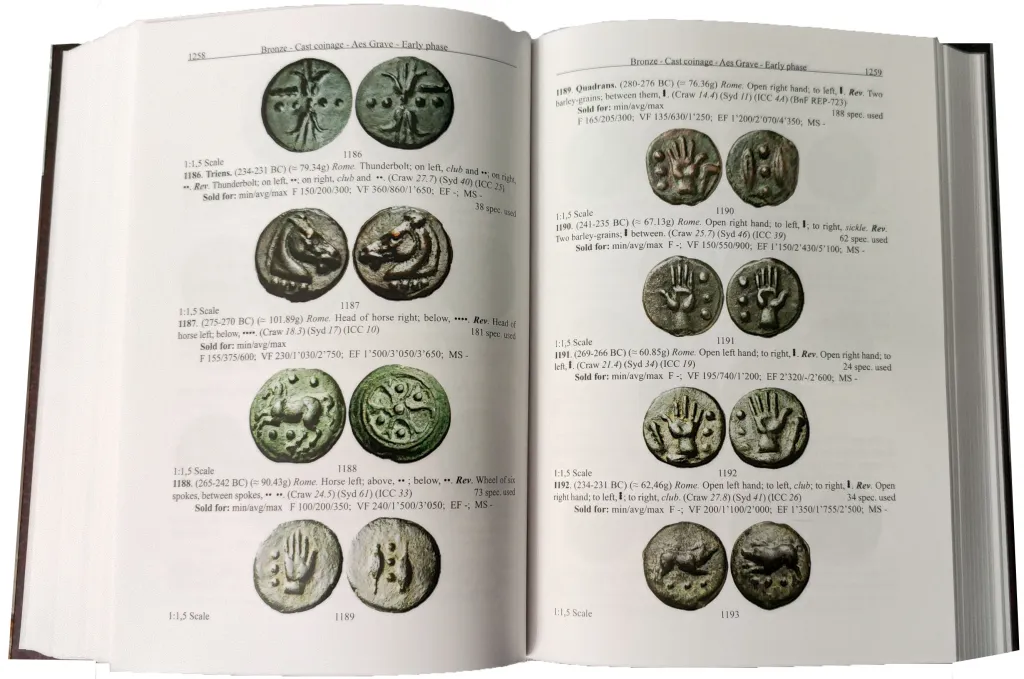 This work aims to examine the Roman Republican coinage, covering the period from the irregularly shaped pieces of bronze known as Aes Rude (a.k.a. Aes Infectum or Imperfectum) to the period 8th – 3rd century BC and the beginning of Roman Imperatorial coinage (it will be considered in a separate volume), roughly around 49 BC. The purpose of this catalogue does not lie in providing a complete analysis of all aspects of the Republican coinage. In his work “Roman Republican coinage”, Michael H. Crawford dwells in detail on this topic and needs not be repeated. The current book simply aims to summarize the data already presented by the prominent scholars М. Crawford, А. Banti, L. Simonetti, E. Sydenham, E. Babelon, and all those who have contributed to the study and systematization of the Roman Republican coinage. The book also supplements the existing research by presenting many new coins that lack any previous description, together with their unpublished variants. It also covers a good number of hitherto unknown inscriptions, control marks, symbols, letters, or digits discovered after the publication of the fundamental works by the authors mentioned above. Apart from the main coin types, the classification presented herein describes all available varieties, including those absent in Crawford’s research, each marked with a separate number. All hybrid Republican coins for which I have found sufficient information are analyzed as well. A complete description of the coins issued by the mints during The Social War – the so-called denarii of the Marsic Confederation – is also added in this catalog.